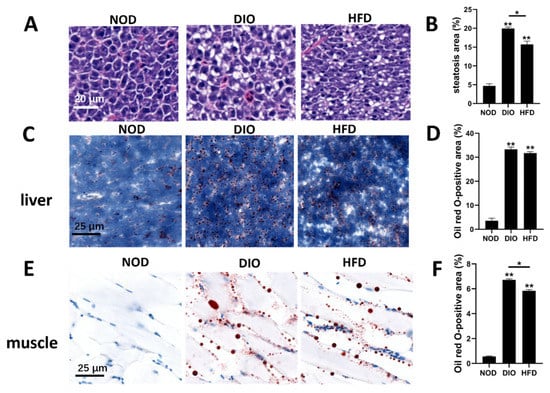 To characterize the effects of NOD, HFD and DIO on tissue structure, liver and muscle were collected and subjected to histological analyses. After 9 weeks of feeding, the livers of three groups were analyzed with hematoxylin and eosin staining. As shown in Figure 3A, a severe steatosis was observed in the livers of the DIO and HFD groups. The areas of hepatic steatosis in DIO and HFD groups were significantly larger than in the NOD group (Figure 3B). To evaluate whether lipids accumulated in the liver and muscle, hepatic and muscular tissues were stained with Oil Red O. A prominent ectopic accumulation of lipids in liver and muscle was observed in HFD and DIO groups (Figure 3C,E). The areas of lipid droplets in the liver and muscle in the DIO and HFD groups were significantly larger than in the NOD group (Figure 3D,F). Together, these results indicate that HFD and DIO caused hepatic steatosis and ectopic accumulation of lipid droplets in liver and muscle.