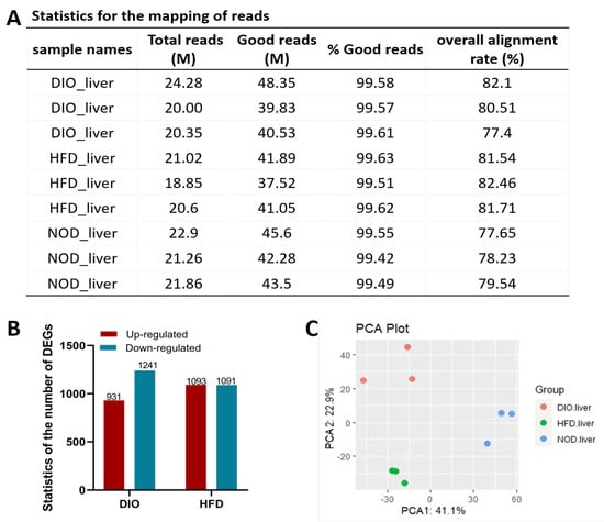 Identification of DEGs induced by HFD and DIO in zebrafish. (A) Statistics for the mapping of reads in three groups. (B) The number of DEGs between groups of different diets (fold change ≥ 1.5 and p-value ≤ 0.05). (C) The principal component analysis (PCA) of differentially expressed genes in three groups.