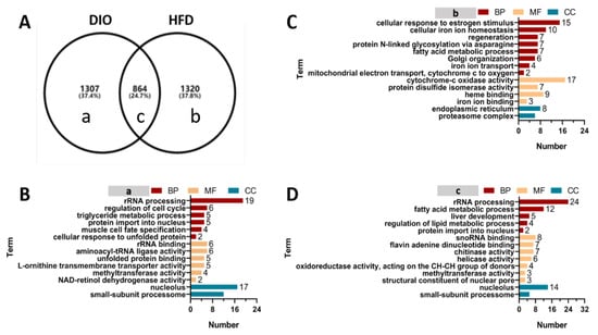 To further explore the differences in biological processes (BP), cellular composition (CC) and molecular functions (MF) in DIO and HFD, all DEGs were divided into three groups by a Venn diagram analysis (a–c) (Figure 5A; Table S2). The DEGs in group (a) represent genes specifically expressed in the DIO group, which account for 37.4% of all DEGs. The DEGs in group (b) were specifically expressed in the HFD group, which account for 37.8% of the total DEGs. The DEGs in group (c) were shared by both the DIO and HFD groups, which account for 24.7% of all DEGs.