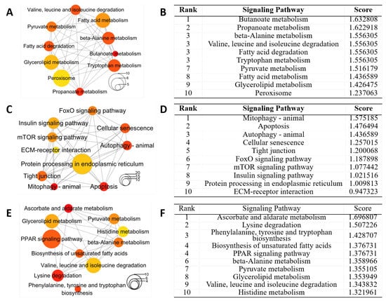 Among the signaling pathways enriched from the DEGs in group (a), the top three hub signaling pathways were butanoate metabolism, propanoate metabolism and beta-alanine metabolism (Figure 6A,B). Among the signaling pathways enriched from the DEGs in group (b), the top three hub signaling pathways were mitophagy—animal, apoptosis and autophagy—animal (Figure 6C,D). Among the signaling pathways enriched from DEGs in groups (c), the top three hub signaling pathways were ascorbate and aldarate metabolism, lysine degradation and phenylalanine, tyrosine and tryptophan biosynthesis (Figure 6E,F).
