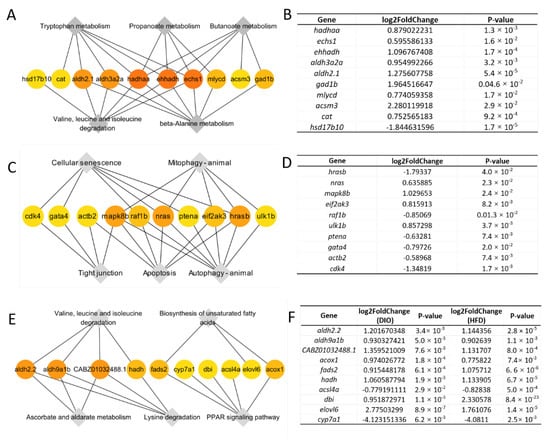 We also examined the hub genes with CytoHubba. In group (a), the hub genes (hadhaa, echs1, ehhadh, aldh3a2a, aldh2.1, gad1b, mlycd, acsm3, cat and hsd17b10) were clustered into beta-alanine metabolism, tryptophan metabolism, valine, leucine and isoleucine degradation, propanoate metabolism and butanoate metabolism (Figure 7A,B). The hub genes (hrasb, nras, mapk8b, eif2ak3, raf1b, ulk1b, ptena, gata4, actb2 and cdk4) in group (b) were clustered into tight junction, cellular senescence, autophagy—animal, apoptosis and mitophagy—animal (Figure 7C,D). Similar to those in groups (a) and (b), the hub genes (aldh2.2, aldh9a1b, CABZ01032488.1, acox1, fads2, hadh, acsl4a, dbi, elovl6 and cyp7a1) in group (c) were clustered into PPAR signaling pathway, valine, leucine and isoleucine degradation, lysine degradation, biosynthesis of unsaturated fatty acids and ascorbate and aldarate metabolism (Figure 7E,F).