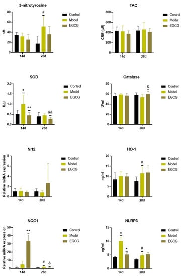 Changes in the oxidant/antioxidant markers in the lung of saline-instilled animals (Control), silica-instilled non-treated animals (Model), and EGCG-treated silica-instilled animals (EGCG) after 14 days (14d) or 28 days (28d) of the treatment delivery. Abbreviations: TAC: total antioxidant capacity; SOD: superoxide dismutase; Nrf2: nuclear factor erythroid-derived 2-like factor 2; HO-1: heme oxygenase; NQO-1: NAD(P)H:quinone oxidoreductase-1; NLRP3: nucleotide-binding and oligomerization domain-like receptor. For statistical differences among the groups: * p < 0.05 for Model14d vs. Control14d; + p < 0.05 and ++ p < 0.01 for EGCG14d vs. Model14d; # p < 0.05 for Model28d vs. Control28d; & p < 0.05 and && p < 0.01 for EGCG28d vs. Model28d.