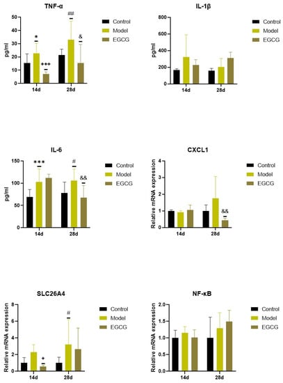 Changes in the inflammatory markers in the lungs of saline-instilled animals (Control), silica-instilled non-treated animals (Model), and EGCG-treated silica-instilled animals (EGCG) after 14 days (14d) or 28 days (28d) of the treatment delivery. Abbreviations: TNFα: tumor necrosis factor alpha; IL-1β: interleukin-1beta; IL-6: interleukin-6; CXCL1: chemokine (C-X-C motif) ligand 1; SLC26A4: solute carrier family 26, member 4; NF-κB: nuclear factor-kappa B. For statistical differences among the groups: * p < 0.05 and *** p < 0.001 for Model14d vs. Control14d; + p < 0.05 and +++ p < 0.001 for EGCG14d vs. Model14d; # p < 0.05 and ## p < 0.01 for Model28d vs. Control28d; & p < 0.05 and && p < 0.01 for EGCG28d vs. Model28d.
