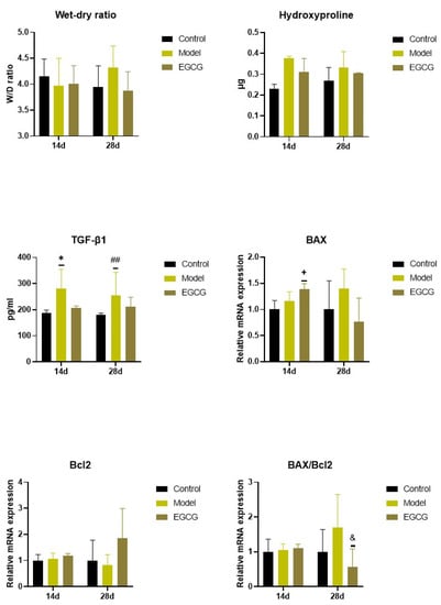Changes in the W/D ratio and in the markers of apoptosis and fibrosis in the lungs of saline-instilled animals (Control), silica-instilled non-treated animals (Model), and EGCG-treated silica-instilled animals (EGCG) after 14 days (14d) or 28 days (28d) of the treatment delivery. Abbreviations: TGF-β1: transforming growth factor-beta 1; Bcl-2: B-cell lymphoma 2 protein; BAX: Bcl-2 associated X-protein. For statistical differences among the groups: * p < 0.05 for Model14d vs. Control14d; + p < 0.05 for EGCG14d vs. Model14d; ## p < 0.01 for Model28d vs. Control28d; & p < 0.05 for EGCG28d vs. Model28d.