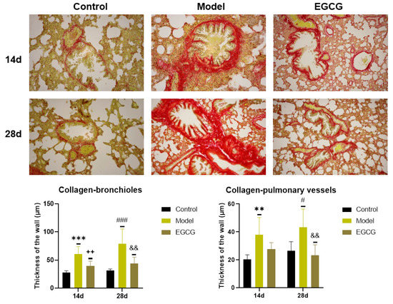 Immunohistochemical investigation by Sirius red staining was used for the detection of collagen accumulation. The results showed a significant increase in the thickness of the walls of bronchioles (both p < 0.001 after 14 and 28 days) and pulmonary vessels (p < 0.01 after 14 days, p < 0.05 after 28 days) in the silica-instilled vs. saline-instilled animals. In EGCG-treated animals, a decrease in collagen mass was observed in the walls of bronchioles (both p < 0.01 after 14 and 28 days) and pulmonary vessels (p > 0.05 after 14 days, p < 0.01 after 28 days) (Figure 4).