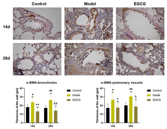 Immunohistochemical determination of the smooth muscle mass presence in the lungs of saline-instilled animals (Control), silica-instilled non-treated animals (Model), and EGCG-treated silica-instilled animals (EGCG) after 14 days (14d) or 28 days (28d) of the treatment delivery. Presence of smooth muscle mass was verified by using antibody against α-smooth muscle actin (SMA) and was expressed as a thickness of the walls of bronchioli and pulmonary vessels (in μm). For statistical differences among the groups: * p < 0.05 for Model14d vs. Control14d; + p < 0.05 and ++ p < 0.01 for EGCG14d vs. Model14d; ## p < 0.01 for Model28d vs. Control28d; & p < 0.05 and && p < 0.01 for EGCG28d vs. Model28d.