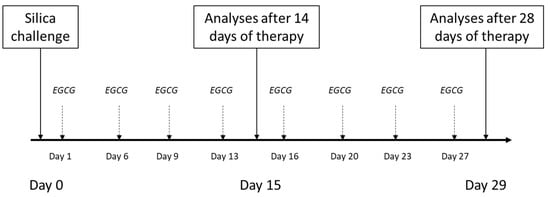 Schematic study protocol for induction of the silicosis and delivery of the treatment. Silica particles suspended in saline were instilled orotracheally at day 0. Treatment with intraperitoneal EGCG at a dose of 20 mg/kg b.w. was initiated the next day after silica instillation (day 1) and was given twice a week. The analyses were performed after 14 days and 28 days of the treatment administration.