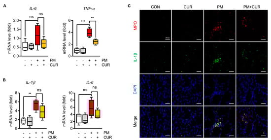 Curcumin downregulated the expression of IL-1β, IL-6, and TNF-α in PM-induced inflammation in mice lung tissue and BALF. (A) Effect of curcumin on PM-induced inflammatory cytokine production in lung tissue determined by RT-qPCR. (B) Effect of curcumin on PM-induced inflammatory cytokine production in BALF. (C) Co-localization of IL-1β with MPO was observed after immunofluorescence staining using indicated antibodies. Scale bars indicate 200 μm. ** p < 0.01, *** p < 0.005, and ns (not significant) indicates p ≥ 0.05 vs. PM-treated group. CON, control group; CUR, curcumin; PM, particulate matter (n = 6 per group).