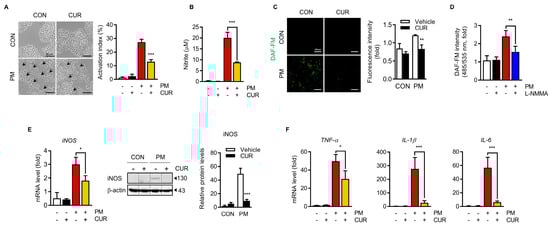 Curcumin attenuated PM-induced nitrite production and inflammatory cytokine expression in RAW264.7 macrophage cells. Effect of curcumin on (A) the dendritic transformation of PM-stimulated RAW264.7 cells. Cells were pre-incubated with 10 μM of curcumin for 1 h, and then treated with 20 μg/cm2 of PM for 24 h. Cell morphology was monitored under light microscope at ×200 magnitude. Activated RAW264.7 cells are indicated by arrows. Scale bars indicate 50 μm. The activation index percentage was expressed as the number of cells with activated morphology relative to the total number of cells, quantified as 7 random fields with total cells above 300. (B) Nitrite levels of RAW264.7 macrophage cells against PM-stimulated condition. RAW264.7 were pretreated with curcumin for 1 h, and incubated with PM for 12 h. Nitrite content in the cell supernatants was measured using Griess reaction assay. (C) Intracellular oxidative nitrosylation was monitored with fluorescence probe DAF-FM and relative intensity of fluorescence was indicated. Scale bars indicate 200 μm. (D) After treatment with L-NMMA, a NOS inhibitor, the levels of oxidative nitrosylation were measured by DAF-FM probe. (E) Expression of iNOS mRNA and protein. (F) Expression of proinflammatory cytokines (TNF-α, IL-1β, and IL-6) by RT-qPCR. Data presented as the mean ± SD of three independent experiments. *** p < 0.005, ** p < 0.01, * p < 0.05 vs. PM10-treated group. CON, control group; CUR, curcumin; PM, particulate matter.