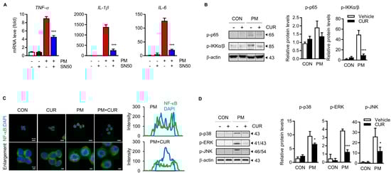 Inhibitory effect of curcumin on PM-induced cytokine production is dependent on MAPK and NF-κB signaling pathways. (A) NF-κB cell permeable inhibitory peptide (SN50) inhibits translocation of NF-κB and production of inflammatory cytokines. RAW264.7 cells were pretreated for 1 h with 10 μM of SN50, an inhibitor of NF-κB, and then treated for 6 h with 20 μg/mL of PM. mRNA levels of TNF-α, IL-1β, and IL-6 were assessed using RT-qPCR. (B) Effect of curcumin on PM-induced phosphorylation of NF-κB and IKKα/β in RAW264.7 macrophages. Activation of NF-κB was indicated by measuring the level of phosphorylation of p65 and IKKα/β via immunoblotting techniques and subsequent quantification of them with the use of ImageJ software. (C) Effect of curcumin on PM-induced nuclear translocation of NF-κB p65 in RAW264.7 macrophages. Confocal imaging shows subcellular distribution of NF-κB. Images show low- (upper; scale bars, 40 μm) and high-power magnification (lower; scale bars, 10 μm). Spatial profiles of fluorescence intensity of NF-κB along with DAPI, indicating nuclear DNA. (D) Effect of curcumin on PM-induced phosphorylation of MAPKs, including p38, ERK, and JNK, in RAW264.7 macrophages. Data represented as the mean ± SD of three independent experiments. *** p < 0.001, * p < 0.05 vs. PM-treated group. CON, control group; CUR, curcumin; PM, particulate matter.