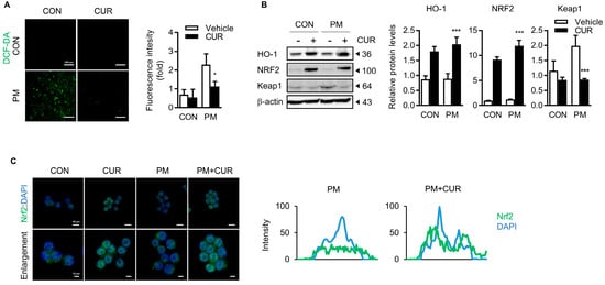 Inhaled PM results in the increased production of ROS, a signaling molecule, and oxidative stress, triggering molecular events for the downstream induction of inflammation and tissue injury. Thus, we investigated whether curcumin affected the PM-induced intracellular ROS production in RAW264.7 macrophages. As expected, PM-stimulated RAW264.7 cells showed an increase of over three-fold in the intracellular ROS levels than the untreated control cells, which was significantly attenuated by curcumin pretreatment (Figure 5A). Under oxidative stress conditions, Nrf2 plays an important role in modulating antioxidant activity as a master transcription factor. To control redox homeostasis, Nrf2 dissociates from Kelch-like ECH-associated protein 1 (Keap1), a chief negative regulator of Nrf2, and translocates into the nucleus from the cytoplasm and binds to ARE, leading to the transcription of antioxidant genes. Immunoblot analyses were performed to compare the expression of Keap1, Nrf2, and its downstream target gene, HO-1. The results shown in Figure 5B demonstrate that the protein expression levels of HO-1 and Nrf2 were significantly enhanced with the treatment of curcumin. While the expression of Nrf2 and HO-1 was not affected by PM treatment, the expression of the Keap1 protein was markedly higher with PM treatment than in the untreated control (CON and CUR). This increased expression of Keap1 was significantly downregulated by the pretreatment of curcumin. As shown in the immunofluorescence images in Figure 5C, curcumin treatment clearly promoted the nuclear translocation of Nrf2, as confirmed by the spatial profiles of fluorescence intensity, along with the nuclear DNA. This suggested that PM-induced oxidative stress was prevented by curcumin pretreatment via the inhibition of the Keap1 protein and consequent activation of Nrf2, which resulted in a significant increase in the antioxidant molecule HO-1.