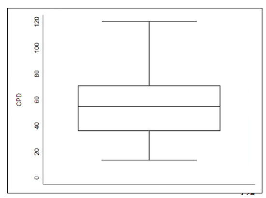 Whisker plot representing the CPD values for all dogs (n = 34). Median CPD value was 54.94 (25th percentile = 36.99; 75th percentile = 70.75). Higher CPD correlates with higher cellular IHC staining intensity of IGF2R.