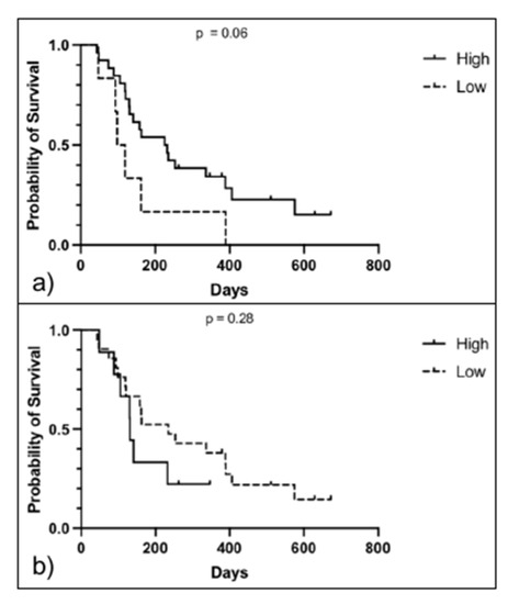 Kaplan–Meier survival analysis of all canine OS with high and low IFG2R expression. (a) Survival analysis of dogs with high versus low IGF2R expression on VIS. Survival time did not differ between high (229 days, 95% CI 85–524) and low (108 days, 95% CI 19–118) VIS (p = 0.06, Log Rank test; n = 25) (b) Survival analysis of dogs with high versus low IGF2R expression on CPD score. Survival time did not differ between high (131 days, 95% CI 23–134) and low (235 days, 95% CI 74–433) CPD score (p = 0.28, Log Rank test; n = 25).