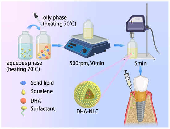 Schematic diagram of the preparation and application of the DHA-NLC. A DHA-loaded NLC was fabricated using heating and ultrasonication methods. A surfactant constituted the peripheral spherical shell, while DHA and squalene were encapsulated inside. DHA-loaded NLC exerted anti-inflammatory effects in a rat model of peri-implantitis by attenuating the pro-inflammatory factor levels and preventing alveolar bone resorption. NLC, nanostructured lipid carrier. DHA, docosahexaenoic acid.