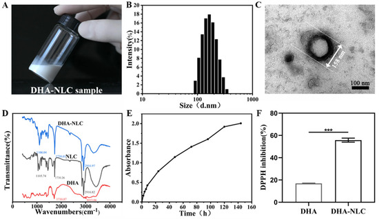 Photographic image and characterization of DHA-NLC. (A) Emulsibility of DHA-NLC. (B) Particle sizes of DHA-NLC. (C) TEM of DHA-NLC. Scale bar: 100 nm. (D) FITR spectra of NLC, DHA, and DHA-NLC. (E) Release curve of DHA-NLC. (F) DPPH inhibition rate of DHA and DHA-NLC. LPS, lipopolysaccharide. *** p < 0.001. NLC, nanostructured lipid carrier. DHA, docosahexaenoic acid.