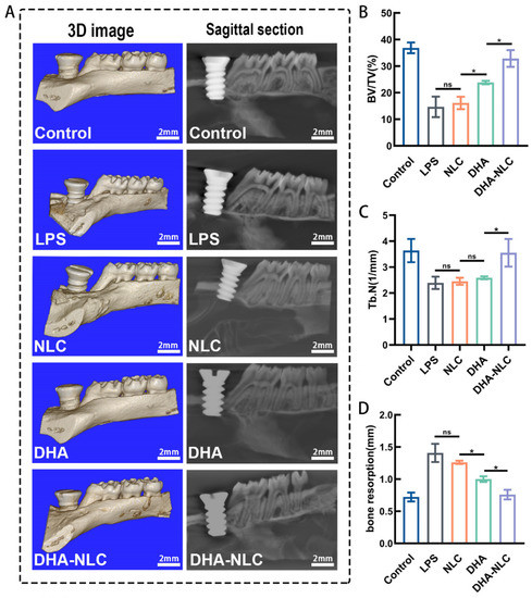 Effect of each group on bone resorption in the peri-implantitis model in vivo. (A) Micro-CT images of the rat alveolar bone. (B,C) Bone morphometric parameters: bone volume/tissue volume (BV/TV) and trabecular number (Tb.N) around the titanium implants (n = 3). (D) Bone resorption level (n = 3). Scale bars: 2 mm. * p < 0.05. LPS, lipopolysaccharide. NLC, nanostructured lipid carrier. DHA, docosahexaenoic acid.