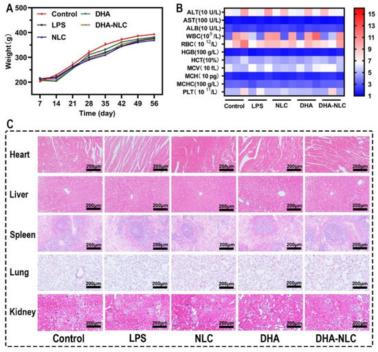 Biosafety of each group in vivo. (A) Effect of each group on rat weight during the experimental period. (B) Effect of each group on alanine aminotransferase (ALT), aspartate aminotransferase (AST), albumin (ALB), white blood cells (WBC), red blood cells (RBC), hemoglobin (HGB), hematocrit (HCT), mean corpuscular volume (MCV), mean corpuscular hemoglobin (MCH), mean corpuscular hemoglobin concentration (MCHC), and platelet (PLT) levels. (C) H&E staining of the heart, liver, spleen, lung, and kidney tissues. Scale bars: 200 μm. LPS, lipopolysaccharide. NLC, nanostructured lipid carrier. DHA, docosahexaenoic acid.