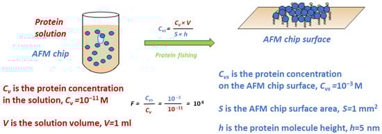 Let us focus on another aspect of interpreting the concept of “concentration” in the novel science. As mentioned above, AFM allows the signals from a single biomacromolecule to be detected. The necessary condition is the fixation of molecules on the surface (atomically smooth substrate). We have shown that chemical fishing can be used to force biomolecules to a specific zone (the so-called “delivery”) and immobilize them on the substrate. This type of fishing involves capturing biomolecules from a large volume of analyte solution to a small substrate surface and immobilizing them via covalent bonding between protein amino acid groups and active moieties on the surface (Figure 1). The covalent bonding contributes to capturing irreversibility and prevents the thermodynamically induced desorption of molecules from the surface. A concentrating efficiency of eight orders (concentrating factor of 108) can be achieved by analyzing 1 mL of the solution [50]. Therefore, although the molecular concentration in the analyzed solution was 10−11 M, it was much higher on the surface (the near-surface volume occupied by molecules on the substrate): 10−3 M, which significantly facilitated molecule detection. This aspect of considering the concentration also makes it possible to integrate “single-molecule sensors” into the bioanalysis system.