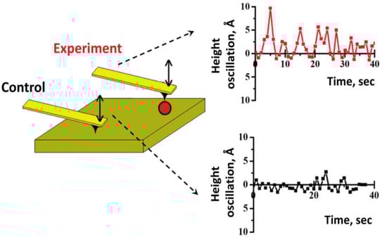 Pilot experiments aimed at assessing the activity of individual molecules using the AFM data showed the biomolecule height oscillation for the enzyme molecule (P450 CYP102A1) adsorbed on the surface (Figure 2). The oscillation amplitude depended on the stage of the functional cycle of the enzyme, allowing the functional activity (the measured changes in height expressed in angstrom (Å) units) to be estimated using the AFM data: the resting enzyme molecule, 0.60 Å, after adding a substrate (no activation, non-working system), 0.62 Å, after adding a second substrate (the system is activated), 1.43 Å, after adding an inhibitor (the system became inactive), 0.55 Å The data obtained showed that the signal from a single functionally active biomolecule was twice as high as that from a biomolecule in the inactive state. Comparable results were obtained using horseradish peroxidase. However, a pilot series of experiments revealed an interesting fact: monitoring 50 molecules demonstrated that there were “hard worker” and “lazy worker” molecules despite the active stage of the enzyme cycle. Therefore, the data obtained earlier [3] in the cell system by measuring mRNA expression were confirmed. The future areas of research will involve identifying a relationship between the AFM data (molecule height oscillation expressed in Å units) and protein activity and determining the parameters of the enzymatic reaction using classical biochemistry methods.
