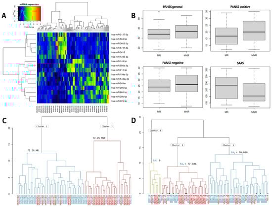 (A) Heatmap with the results of the hierarchical clustering of MR and MNR samples. (B) Box-plots with the MR and MNR punctuations on the PANSS general, positive, negative, and SAAS scales. The overlap between both groups can be seen. (C) Hierarchical clustering with MR samples (blue) and MNR samples (red); more than 70% of samples of both conditions were clustered homogeneously. (D) Hierarchical clustering with samples in MR, MNR, and PA groups. MR samples are colored in blue, MNR samples in red and PA samples were marked with a dot and colored in blue or red depending on the evolution of their psychotic episode.