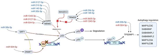Pathway in which differentially expressed miRNAs could be involved, potentially related to the antipsychotic resistance in schizophrenia. MiRNAs are colored according to their expression in the MNR group when compared to the MR group; red indicates overexpression and blue underexpression. Sirtuin 1 (SIRT1) interacts with the DNA Methyltransferase 1 (DNMT1) and the Tumor Protein P53 (p53) regulating its expression. Proteins MDM2 Proto-Oncogene (MDM2), MAGE Family Member C2 (MAGEC2), and RING Finger Protein 96 (TRIM28) are closely linked with p53 inactivation and heavily targeted by the miRNAs of our TRS profile. This inactivation of p53 is through ubiquitination (p53Ub), which leads to its degradation. Acetylated p53 (p53Ac) acts as a transcriptional factor of several genes, from which Tumor Protein P53 Inducible Nuclear Protein 1 (TP53INP1) is the one most targeted by the TRS profile. This protein is a positive regulator of the autophagy and also acts as a transcription regulator in response to cellular stress. This regulation is made through its interaction with GABA Type A Receptor-Associated Protein (GABARAP), with GABA Type A Receptor Associated Protein Like 1/2 (GABARAPL1, GABARAPL2) and with Microtubule Associated Protein 1 Light Chain 3 Alpha/Beta/Gamma (MAP1LC3A, MAP1LC3B, MAP1LC3B).
