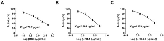 To evaluate the inhibitory effect of RGE on the interaction of human PD-1 (hPD-1) and human PD-L1 (hPD-L1), we conducted a competitive ELISA targeting hPD-1/hPD-L1. RGE exhibited strong inhibitory activity against the hPD-1/hPD-L1 interaction with a 50% inhibitory concentration (IC50) value of 176.2 μg/mL (Figure 1A). The IC50 for the neutralized antibody as a positive control for hPD-1 was 2.864 μg/mL and 4.103 μg/mL for hPD-L1 (Figure 1B,C). These data show that RGE is a potent immune checkpoint inhibitor targeting hPD-1/hPD-L1 in vitro.