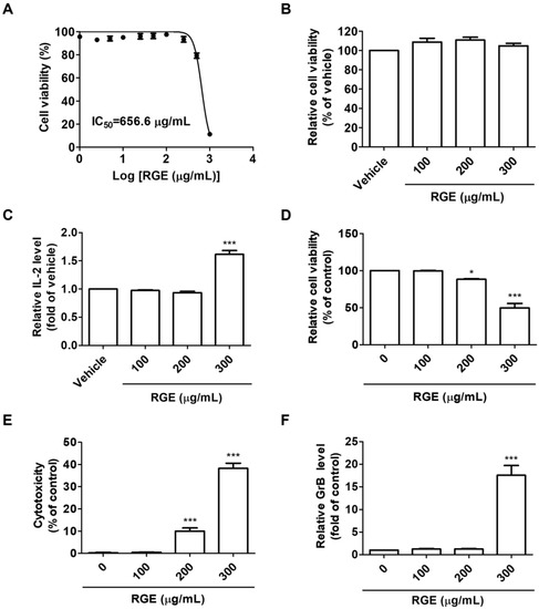 RGE activates hPD-1 tumor-infiltrating CD8+ T cells and cytotoxic effect of CD8+ T cells on hPD-L1 MC38 cancer cells. (A,B) Cell viability against hPD-L1 MC38 cells (A) and hPD-1 tumor-infiltrating CD8+ cells (B) conducted by MTT assay after treatment with RGE for 72 h. (C) Relative IL-2 levels in the supernatant of hPD-1 tumor-infiltrating CD8+ cells treated with RGE for 72 h as measured by a mouse IL-2 ELISA. (D) Co-cultured hPD-L1 MC38 cell viability was evaluated using the CCK assay. (E) Cytotoxicity in co-cultured hPD-L1 MC38 cells was detected by an LDH cytotoxicity assay. (F) Relative GrB levels in the co-culture supernatants at 72 h were determined by a mouse GrB ELISA. Data are presented as the mean ± SD, * p < 0.05, *** p < 0.001 compared with the control.