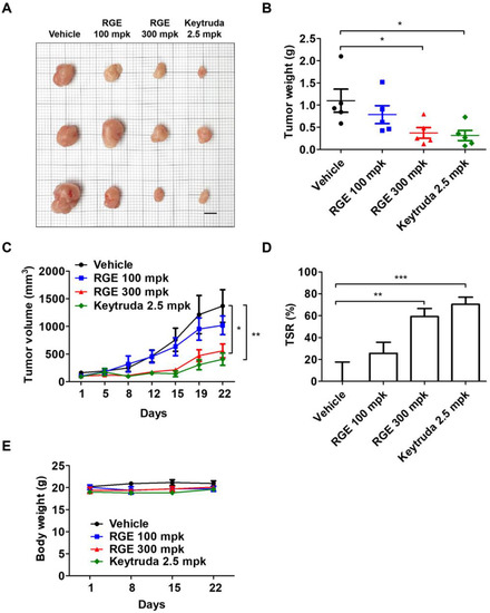 Antitumor effect of RGE in a human PD-1/PD-L1 MC38 cell allograft mouse model. (A) Images of the harvested tumor tissues in vehicle, RGE 100, 300 mg/kg, and Keytruda (anti-PD-1) 2.5 mg/kg groups on day 22 (n = 3, bar indicates 1 cm). (B) Tumor weight on day 22. (C) The growth curve based on tumor volume over 22 days. (D) Tumor suppression rate on day 22. (E) Body weight (grams) over 22 days. Data are presented as the mean ± SD, * p < 0.05, ** p < 0.01, *** p < 0.001 compared with the control.