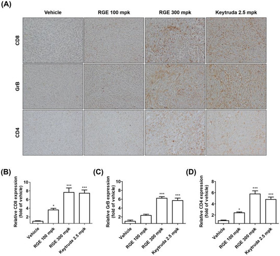 RGE activates hPD-1 tumor-infiltrating CD8+ T cells in vivo by immunohistochemical staining. (A) Representative images (×400) of CD8+, GrB, and CD4+ staining of tumor tissues by immunohistochemical analysis. (B–D) Quantification of CD8+ (B), GrB (C), and CD4+ (D) expression in tumor tissues. Data are presented as the mean ± SD, * p < 0.05, *** p < 0.001 compared with the control.