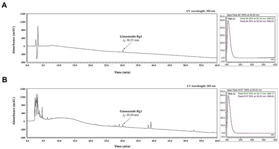 The content of ginsenoside was greatly increased by RGE; thus, ginsenoside Rg3 was selected as a standard for analysis. As shown in Figure 5, ginsenoside Rg3 was well-separated and demonstrated good resolution, while minimizing interference from other analytes. Based on a comparison with the chromatogram, the retention time (tR; 30.25 min of standard, 30.24 min of RGM) and UV spectrum (203 nm) of the standard and ginsenoside Rg3 in RGE were detected.