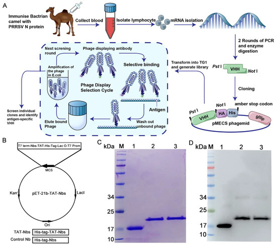 The PRRS epidemic has led to huge losses in the global pig industry [28]. Due to the high variability of the PRRSV genome, no commercial vaccines are able to provide complete protection. Furthermore, there are no effective drugs for treatment of PRRS. Considering the unique properties of nanobodies, they have been widely used in the development of therapeutic antibody drugs, diagnostic reagents, affinity purification substrates, and various other areas of scientific research [29,30]. Although high-affinity monoclonal antibodies have received priority attention in research and clinical applications as potential therapeutics, their production through mammalian cell expression is expensive [31,32]. In contrast, Nbs can be prepared using bacteria or yeast at an extremely low cost, which confers great advantages to Nbs as antiviral therapeutics. However, Nbs face several obstacles as therapeutic drugs, one of which is that they cannot directly cross biological barriers to target virus-associated proteins, due to the selective permeability of cell membranes.