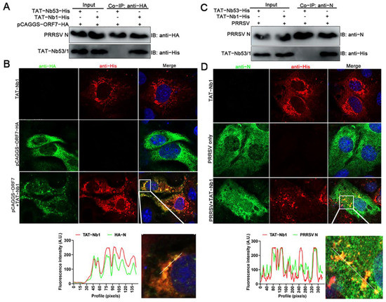 HEK-293T cells were inoculated with 20 μM of TAT-Nb1 or -Nb53 for 6 h, followed by transfection with 2.0 μg pCAGGS-ORF7-HA eukaryotic expression plasmids. After transfection for 48 h, cell samples were harvested and lysed on ice using NP40 lysis buffer containing PMSF. To prepare bead–antibody–antigen complexes, 2 μg of the indicated antibodies were first bound to 40 μL Protein G Megbeads overnight at 4 °C, followed by washing 3 times with PBS. Then, the cell lysates were supplemented, with rotating and incubating for 4 h at 4 °C. After washing 3 times with PBS, the beads attached or unattached to target proteins were boiled with 2 × SDS loading buffer and analyzed by Western blotting. To further confirm the interaction between TAT-Nb1 or -Nb53 and N protein during PRRSV infection, Marc-145 cells incubated with TAT-Nb1 or -Nb53 for 6 h were mock-infected or infected with PRRSV at an MOI of 0.1. At 48 h post-infection (hpi), cell samples were collected, lysed, and subjected to co-IP analysis.