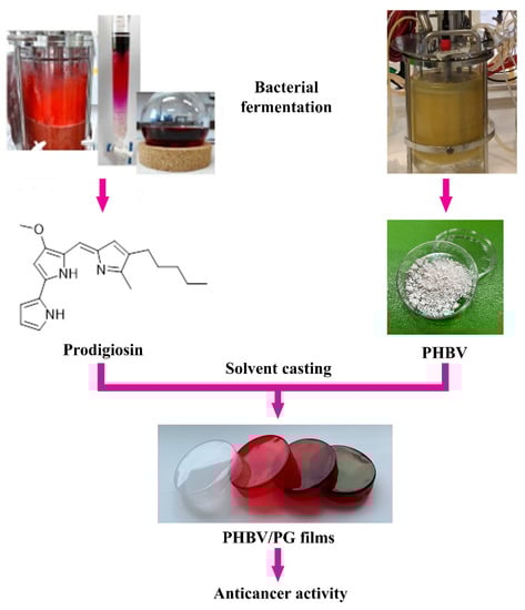 Here, the synthesis and characterization of biocompatible and bioactive biomaterials, in which both structural and functional constituents are of bacterial origin, are reported. These novel materials are based on bacterial polyester PHBV and bacterial pigment PG and are produced using a simple solvent casting method (Figure 1). The effect of PG incorporation on the physical properties (morphology, biopolymer crystallinity and thermal stability) and functionality (anticancer activity) of the obtained biomaterials was also investigated. Notably, a coloring effect of the biomaterials was also observed, which also provides a basis to further examine this and other bacterial natural products as suitable alternatives to chemical colorants.