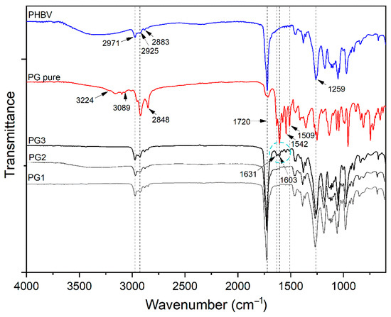 FTIR-ATR spectroscopy was used to confirm the incorporation of PG into the PHBV polymer and the successful preparation of PHBV-PG films. Therefore, spectra of synthesized PHBV, pure PG and appropriate films were collected, and the results are shown in Figure 2. The most prominent bands in the PHBV spectrum appear at 2971 cm−1, 2925 cm−1, 2883 cm−1 and 2850 cm−1, corresponding to the C–H stretching modes of methine, methylene and methyl groups [34]; a strong absorption band at 1720 cm−1, attributed to the stretching vibration of the carbonyl group [35]; bands at 1381 cm−1 and around 1450 cm−1 from the symmetric wagging and bending mode of methyl groups, respectively [34]; and a strong band at 1259 cm−1 coming from the asymmetric stretching of saturated ester (C–O–C) bond. The most important bands in the spectrum of pure PG are broad peaks in the 3224–3089 cm−1 region and a band at 1603 cm−1 that can be attributed to secondary N–H bonds; peaks at 2953 cm−1, 2920 cm−1 and 2848 cm−1 from C–H stretching; a strong band at 1631 cm−1 from stretching of the –C=N– bond; and at 1542 cm−1 from stretching of the C=C double bonds [36]. Finally, the spectrum of the PG3 sample includes all mentioned bands from the PHBV polymer and pure PG spectra, as labeled in Figure 3.