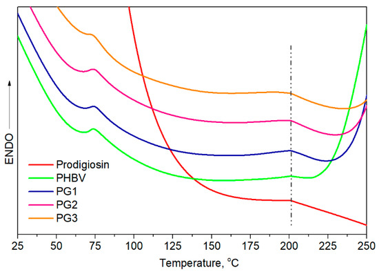 DSC curves of prodigiosin, pure PHBV and biopolymer films with incorporated PG (PG1–PG3).