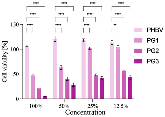 As a compound with anticancer properties, PG represents an attractive candidate for incorporation into therapeutic biomaterials and their development for cancer treatment [39]. The anticancer potential of the obtained PHBV/PG films was evaluated using HCT116 (colon cancer) cells. The results are presented in Figure 7. Treatment with PHBV did not have any effect on the cancer cells. In contrast to this, the addition of PG to the biopolymer matrix improved the antiproliferative effect of the obtained films (Figure 7). All samples containing PG exhibited statistically significantly higher anticancer effects against cancer cells in comparison to the PHBV control. In addition, this effect was concentration dependent. A better anticancer potential was observed when the PG content was higher and when the material extract was more concentrated. Both the PG2 and PG3 samples exhibited excellent anticancer activity at all treatment dilutions, while PG1 (the film with the lowest PG content) was more efficient at higher concentrations (100% and 50%).