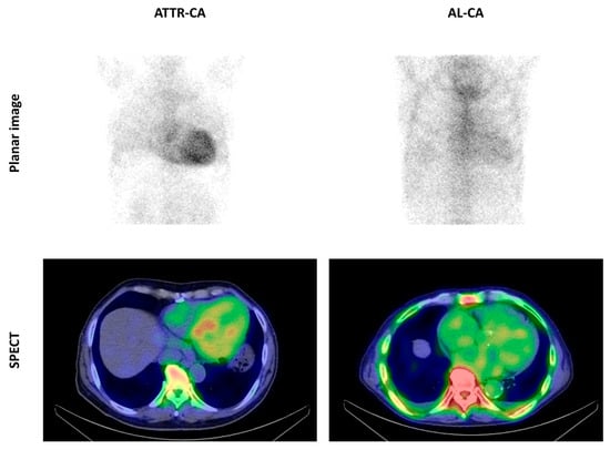 - Perugini, E.; Guidalotti, P.L.; Salvi, F.; Cooke, R.M.; Pettinato, C.; Riva, L.; Leone, O.; Farsad, M.; Ciliberti, P.; Bacchi-Reggiani, L.; et al. Noninvasive etiologic diagnosis of cardiac amyloidosis using 99mTc-3,3-diphosphono-1,2-propanodicarboxylic acid scintigraphy. J. Am. Coll. Cardiol. 2005, 46, 1076–1084. [Google Scholar] [CrossRef] [PubMed]