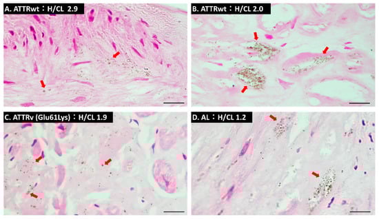 von Kossa staining of myocardial tissues. (A) von Kossa staining of a slice obtained from a patient with wild-type transthyretin cardiac amyloidosis (ATTRwt-CA) whose heart-to-contralateral (H/CL) ratio was 2.9. (B) von Kossa staining of a slice obtained from a patient with ATTRwt-CA whose H/CL ratio was 2.0. (C) von Kossa staining of a slice obtained from hereditary ATTR (ATTRv-CA) whose H/CL ratio was 1.9. (D) von Kossa staining of a slice obtained from a patient with amyloid light-chain cardiac amyloidosis (AL-CA) whose H/CL ratio was 1.2. Red arrows indicate von Kossa-positive microparticles. Scale bars are 10 µm.