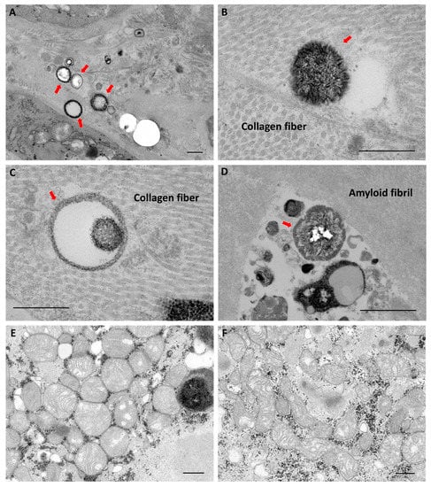 Transmission electron microscopy findings using the myocardial tissue from a patient with transthyretin cardiac amyloidosis. (A–D) Red arrows indicate calcified microparticles. (E,F) Calcification of mitochondria in cardiomyocytes were not observed. The black granules surrounding the mitochondria are glycogen granules. Scale bars are 500 nm.