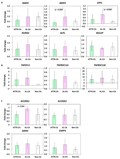 Comparison of bone metabolism-related gene expressions in endomyocardial biopsy samples. (A) Expression levels of osteogenic markers. (B) Expression levels of osteoclastic gene markers. (C) Expression levels of phosphate and pyrophosphate-related genes. N = 11 in the transthyretin cardiac amyloidosis (ATTR-CA) group, N = 6 in the amyloid light-chain cardiac amyloidosis (AL-CA) group, and N = 6 in the noncardiac amyloidosis (non-CA) group. ANOVA/Bonferroni test was performed.