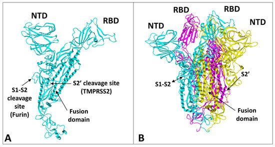 Figure 1. Structural features of SARS-CoV-2 spike protein monomer (A) and pre-fusion trimer (B). NTD, N-terminal domain; RBD, receptor binding domain. In the trimer, the subunits ribbons are colored in cyan, yellow, and magenta. The two proteolytic cleavage sites (S1–S2 and S2′) are indicated in the monomer and (when visible) in the trimer. The models were modified from pdb file 7 bnm.