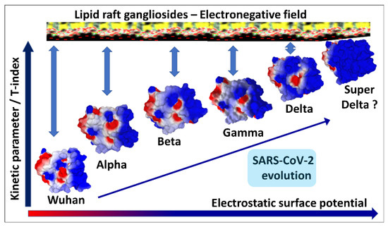 Figure 3. Electrostatic surface potential evolution in the NTD and RBD of SARS-CoV-2 variants (from the original Wuhan strain to Delta). The successive variants of SARS-CoV-2 show increased electrostatic potential of the N-terminal domain (NTD) surface and of the transmissibility T-index. This allows a faster attachment to the electronegatively charged surface of lipid rafts, due to the presence of gangliosides. However, Delta has such a high electrostatic potential that it cannot be further increased. Thus, Delta was a dead-end evolution. Indeed, a “super Delta” variant did not appear after Delta. Blue, electropositive; red, electronegative; white, neutral.