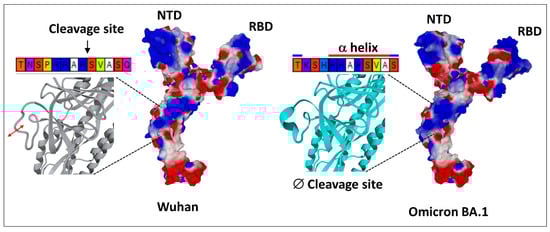 Figure 4. The singularity of Omicron SARS-CoV-2 variant. In the Wuhan strain (left panel), the S1–S2 cleavage site TNSPRRAR*SVASQ is flexible and functional. In the first Omicron variant (BA.1, right panel), the S1–S2 cleavage site is structured and, thus, less flexible and non-functional. One can also note the curved surface of the N-terminal domain (NTD) of Omicron BA.1, compared with the flatter surface of this domain in the Wuhan spike. RBD, receptor binding domain. The structures were modeled from pdb file 7 bnm.