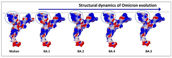 Figure 5. Evolution of the electrostatic surface potential in the Omicron lineage. The N-terminal domain (NTD) is indicated by a circle. Note that the curved surface of BA.1 has evolved to a flatter one from BA.2. Apart from the NTD and the RBD, the electrostatic surface potential of the spike protein does not display significant changes from Wuhan to Omicron BA.5.