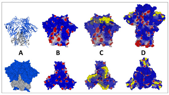 Figure 6. Structural features of HIV-1 gp120 surface envelope glycoprotein and gp120-gp41 trimers, compared with SARS-CoV-2. (A) Ribbon structure (upper panel) and surface representation of the trimeric HIV-1 gp41-gp120 complex (pdb file 6nqd). (B) Electrostatic surface potential of the trimeric HIV-1 gp41-gp120 complex (side view in the upper panel, top view in the lower panel). (C) Same as in (B), with V3 loop amino acid residues represented in yellow atomic spheres. (D). SARS-CoV-2 Omicron BA.1 trimeric spike at the same scale (modeled from pdf file 7 bnm). Amino acid residues of the N-terminal domain (NTD) that are critical for binding to raft gangliosides are represented in yellow atomic spheres.