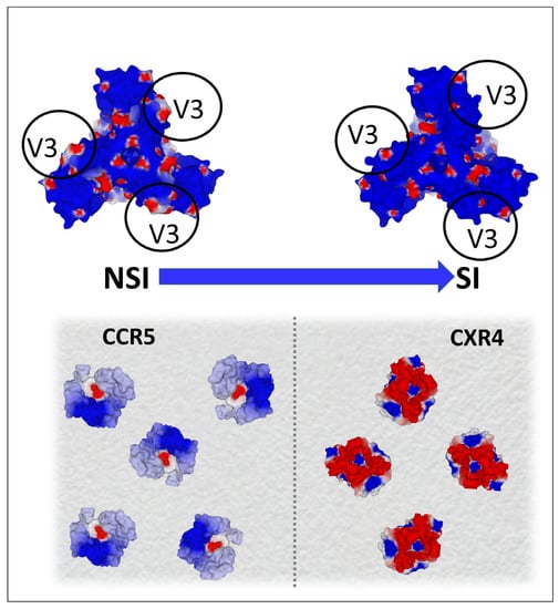 Figure 8. Electrostatic surface potential of CCR5 (pdb file 7f1t) and CXCR4 (pdb file 3oe0) co-receptors as an evolutionary driving force for HIV-1 evolution. The shift from non-syncytium-inducing (NSI) to syncytium-inducing (SI) strains of HIV-1 is associated with a coreceptor switch (from CCR5 to CXCR4). SI strains are more electropositive than NSI strains, due to the accumulation of mutations which increase the net charge of the V3 loop of gp120 (upper panel). This net positive charge increase renders the virus compatible with CXCR4, which is far more electronegative than CCR5 (as shown in the lower panel representing the surface of a lymphocyte). Blue, electropositive; red, electronegative; white, neutral.