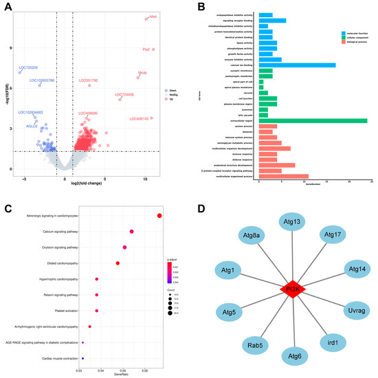 Key genes and signaling pathways are affected in the midguts of egg laying workers (ELWs). (A) Volcano plots of differentially expressed genes between the midguts of nurse workers (NWs) and ELWs (up-regulated genes were signed by red dots and down-regulated genes were signed by blue dots). Each dot represents one gene. The gray dots represent genes that were not differentially expressed. (B) Enrichment of DEGs among the GO terms in the biological process, cellular component, and molecular function categories. (C) Bubble chart of KEGG pathways enriched by up-regulated DEGs in ELWs’ midguts. (D) Protein interaction network of DEGs encoding proteins related to PI3K in the midguts of NWs_vs._ELWs. PI3K interacts with autophagy-related genes.