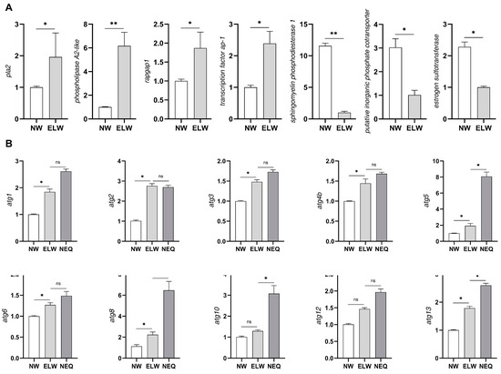 Validation of key DEGs in the midguts of ELWs. (A) Expression profile of transcripts that were differentially expressed between the midguts of NWs and ELWs determined by qRT-PCR. Significant differences between the midguts of NWs and ELWs were determined by Student’s t-test. Asterisks indicate significant differences. * p < 0.05; ** p < 0.01. (B) The expression of autophagic genes was significantly increased in the midguts of ELWs. qRT-PCR quantification of autophagy genes (atg), including atg1, 2, 3, 4b, 5, 6, 8, 10, 12, and 13, from the whole midguts of NWs, ELWs, and newly emerged queens (NEQs). Ribosomal gene rp49 was used as normalization control. Means ± SEM are shown. n = 3. Significant differences between the midguts of NWs, ELWs, and NEQs were determined by one way analysis of variance (ANOVA)/Dunn’s Method. Asterisks indicate significant differences. * p < 0.05; ns = not significant.