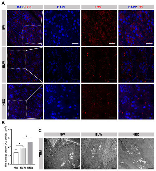 To further confirm the notion that the autophagic genes were up-regulated and autophagy was activated in the midguts of ELWs, we examined the ATG8/LC3 (the widely used autophagic indicator) levels using the LC3A/B antibody in midguts of NWs, ELWs, and NEQs (Figure 3). This rabbit anti-LC3A/B antibody was used to identify autophagosomes in post-embryonic malpighian tubules in Apis mellifera [76]. In the midguts of NWs, only a few LC3+ puncta (autophagosomes/autolysosomes) were dispersedly localized in each crypt (Figure 3A). A significant increase in the size of autophagosomes was observed in the intestines of ELWs, compared with that in NWs (NWs, 1.34 ± 0.04 μm2; ELWs, 1.86 ± 0.14 μm2) (Figure 3A,B). Consistent with the qRT-PCR results, the levels of ATG8 and the size of autophagosomes in the intestines of ELWs were close to those in the midguts of the NEQs (2.55 ± 0.33 μm2) (Figure 3B). The results showed that the levels of LC3 and LC3 puncta in the midguts of ELWs were significantly enhanced compared to those in NWs. The enhanced expression of atg genes and increased accumulation of LC3-positive puncta supported increased induction of autophagy in the midguts of ELWs.