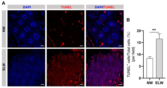 Cell death is significantly increased in the midguts of ELWs. (A) Detection of programmed cell death by TUNEL assay in the midguts of NWs and ELWs. In all the panels except graphs, blue indicates DAPI staining, and red indicates TUNEL-positive cells. Scale bars, 25 µm. (B) The percentage of TUNEL-positive cells in midguts of NWs and ELWs (NWs, 8.37 ± 0.70%, n = 12 intestines; ELWs, 16.61 ± 2.13%, n = 14 intestines). Means ± SEM are shown. Significant differences between the midguts of NWs and ELWs were determined by Student’s t-test. Asterisks indicate significant differences between the midguts of NWs and ELWs. ** p < 0.01.